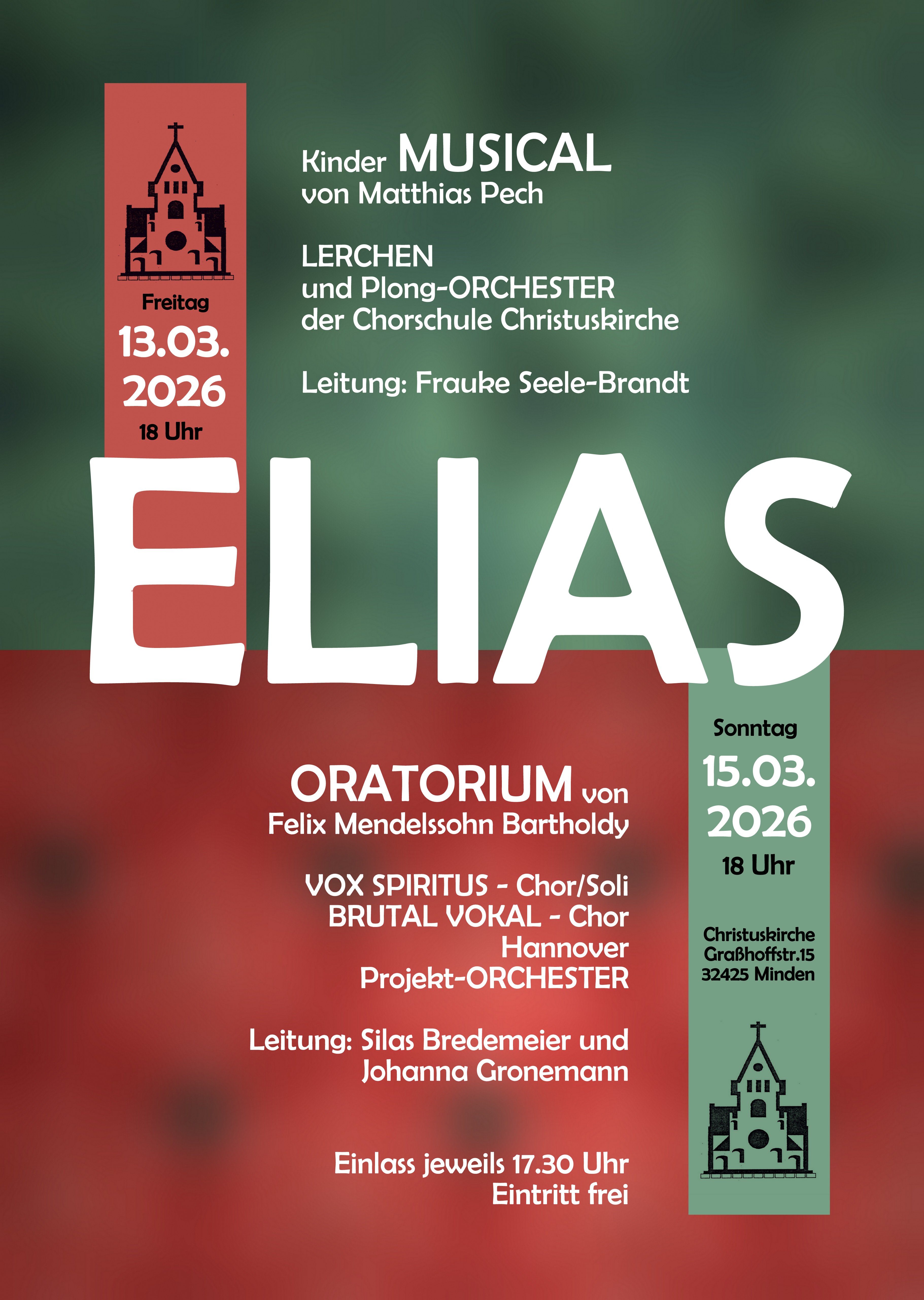 In diesem mitreißenden Kindermusical finden sich viele Motive des gleichnamigen Mendelssohn-Oratoriums wieder und eröffnet das "Elias"-Konzertwochenende. Es singen und spielen die Lerchen der Chorschule Christuskirche. Für die Szene zeichnet Regina Kruse-Mohrhoff verantwortlich. Die Musik, die sich an popularmusikalischen Stilen orientiert, wird gespielt vom erweiterten PLONG-Orchester der Chorschule.